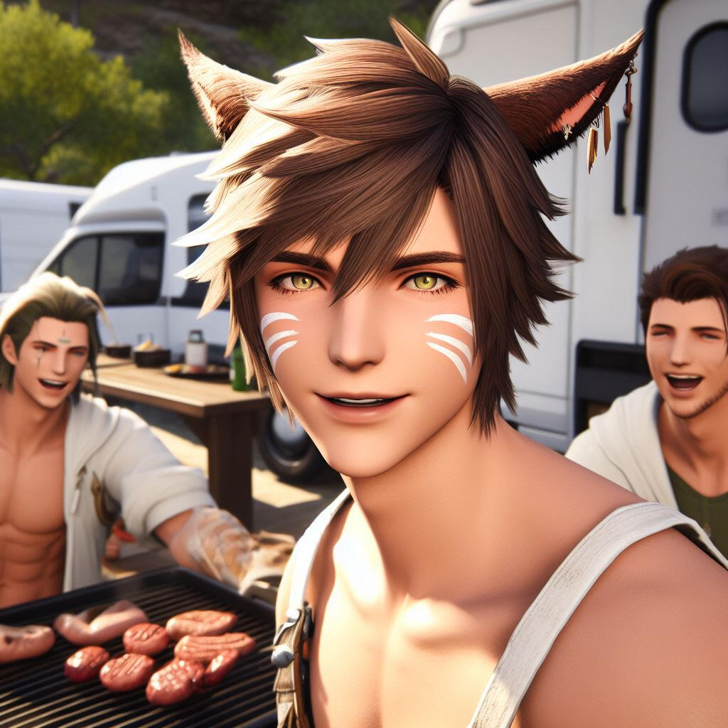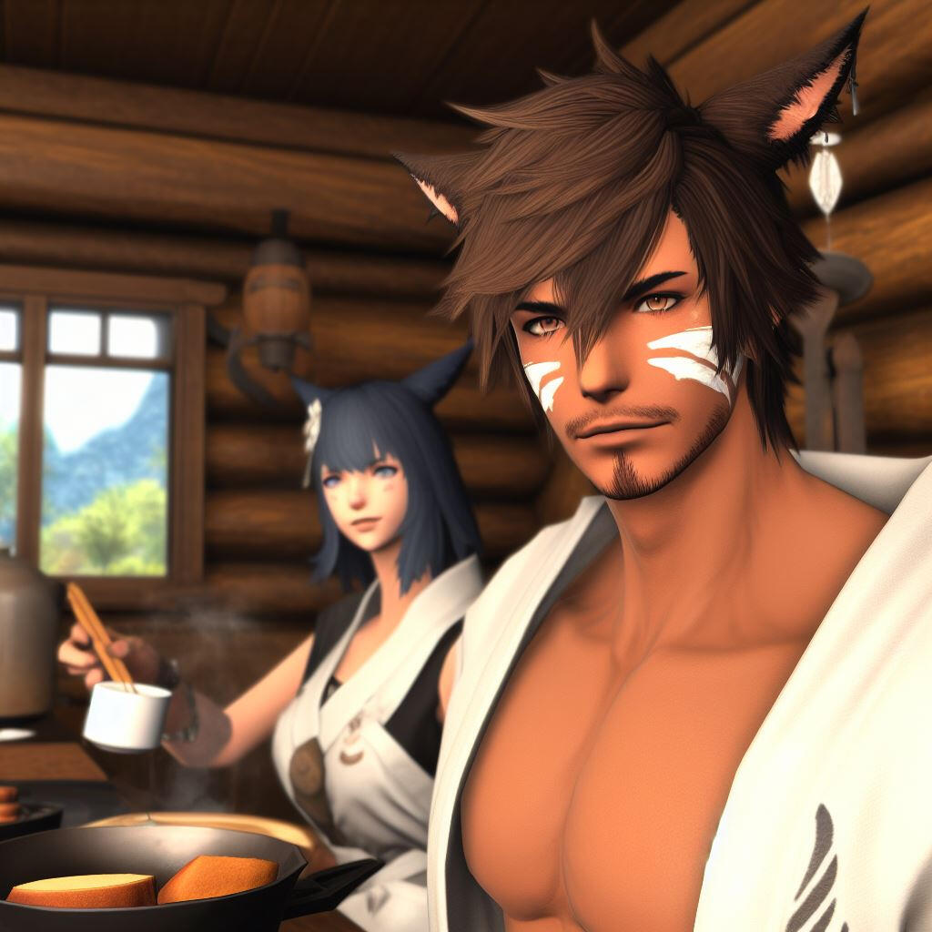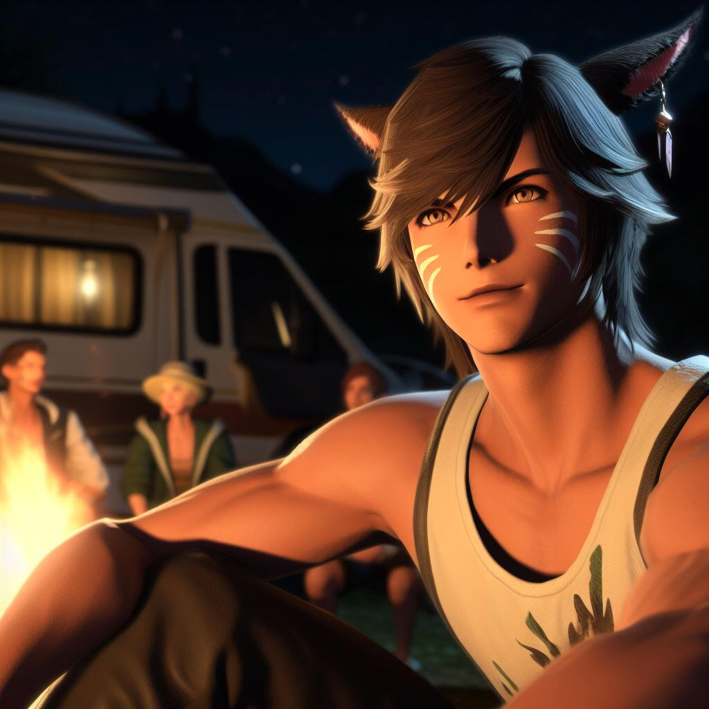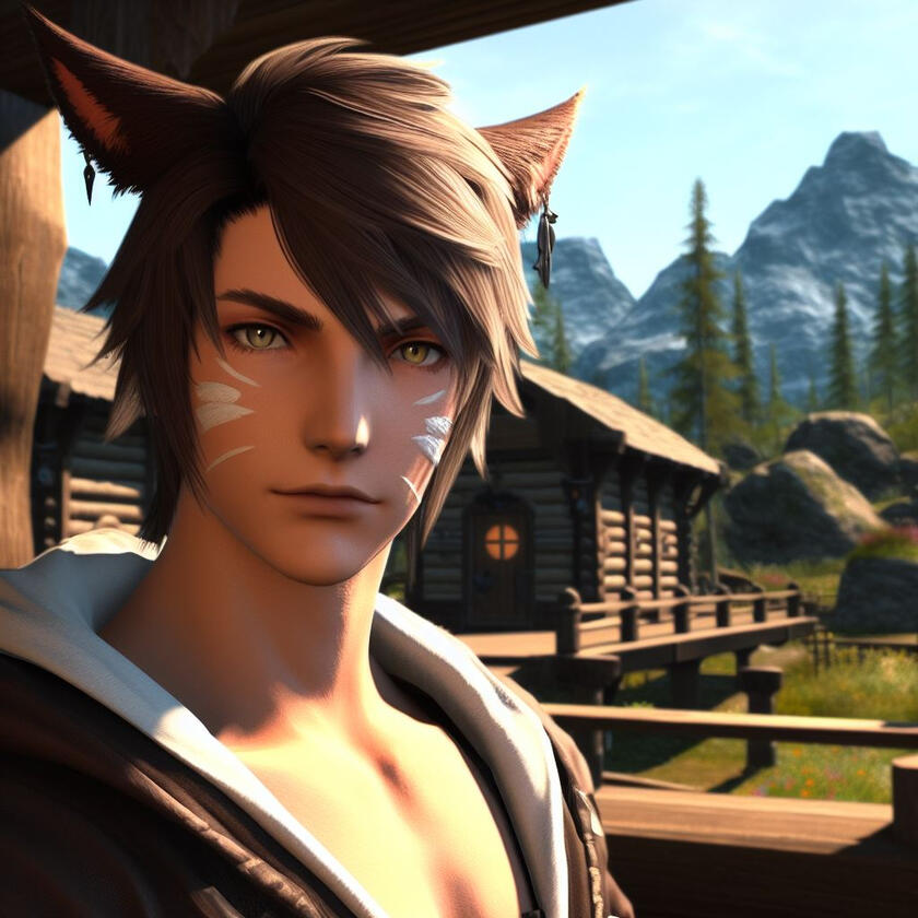 The log cabin sits amongst the natural beauty of the area, surrounded by lush foliage and peaceful animals, a place of peace and tranquility. Kai'to spends a lot of time enjoying the view, whether that's lying in a hammock, sitting on a log or climbing a tree, taking a moment to appreciate the stunning scenery. There are numerous activities to keep everyone entertained, from hiking the nearby trails to fishing in the lake, and from camping on the beach to exploring the town. Every summer, the community comes together for a big event, making the most of the warm and sunny weather. There's always delicious food, music, dancing and laughter, and everyone has a great time. Kai'to Tye lives a peaceful and happy life in the log cabin, surrounded by an incredible community of locals. He loves spending time outdoors, helping and supporting others, and gets to experience the awe-inspiring natural beauty of the area.Once ever year an social event and party takes place on the campsite is something that he looks forward to every year, and Kai'to knows that he is part of a family, a place he will always call home.He helps to clean the area around the cabins, muck out the stables, collect water and help out with any small jobs that may need doing. He has become an integral part of the community, always keeping busy but also providing help and support whenever possible.As he grew apart from his pact, he had chosen to make his home in the city of Kugane, where he could pursue his martial arts training without interruption. He lived as a volunteer in a small village South-East of the central city, where he would help the locals with their daily tasks, fishing, cooking, cleaning, and farming, and respectfully become one of the locals in this tight-knit community.Kai’to is also very fond of his motorcycle, which he often takes on weekend adventures away from home. His travels often take him to various locations around Othard, often running into old friends or discovering new and mysterious locations. With a passion for exploring and a keen eye for treasure, Kai’to shows no signs of slowing down.Kai’to returns to his log cabin on the edge of Kugane to rest and relax with the closest of his friends. Kai’to is an adventurous spirit - always looking for new opportunities and experiences - but at the same time, fiercely loyal and protective of those he cares about. This is a Miqo’te on a mission to make a name of himself and share his many stories with the world.