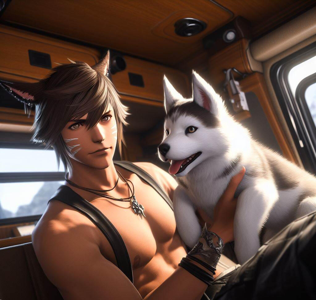 Kai'to decided to make Kugane his home, a small village and collection of log-cabins, tents, and campervans and has now been living in a log-cabin style home on the outskirts of Kugane city for nearly seven years now. The cabin is situated near a beautiful mountain range, surrounded by lush, green forests, and is currently home to around 30 local residents. This small community is very tight-knit, gathering often to socialise and have fun together. Every summer, the group puts on a huge, celebratory event, which all are welcome to join in on. The varying group is comprised of couples, families, and single people alike, all of whom get along and have each other's backs. On the campsite lies a small, fluffy husky puppy, whom Kaito has grown very fond of. He often aids in his own way with whatever tasks the other residents need doing. All in all, Kai'to finds it a pleasure to live in such a welcoming environment alongside these wonderful people.